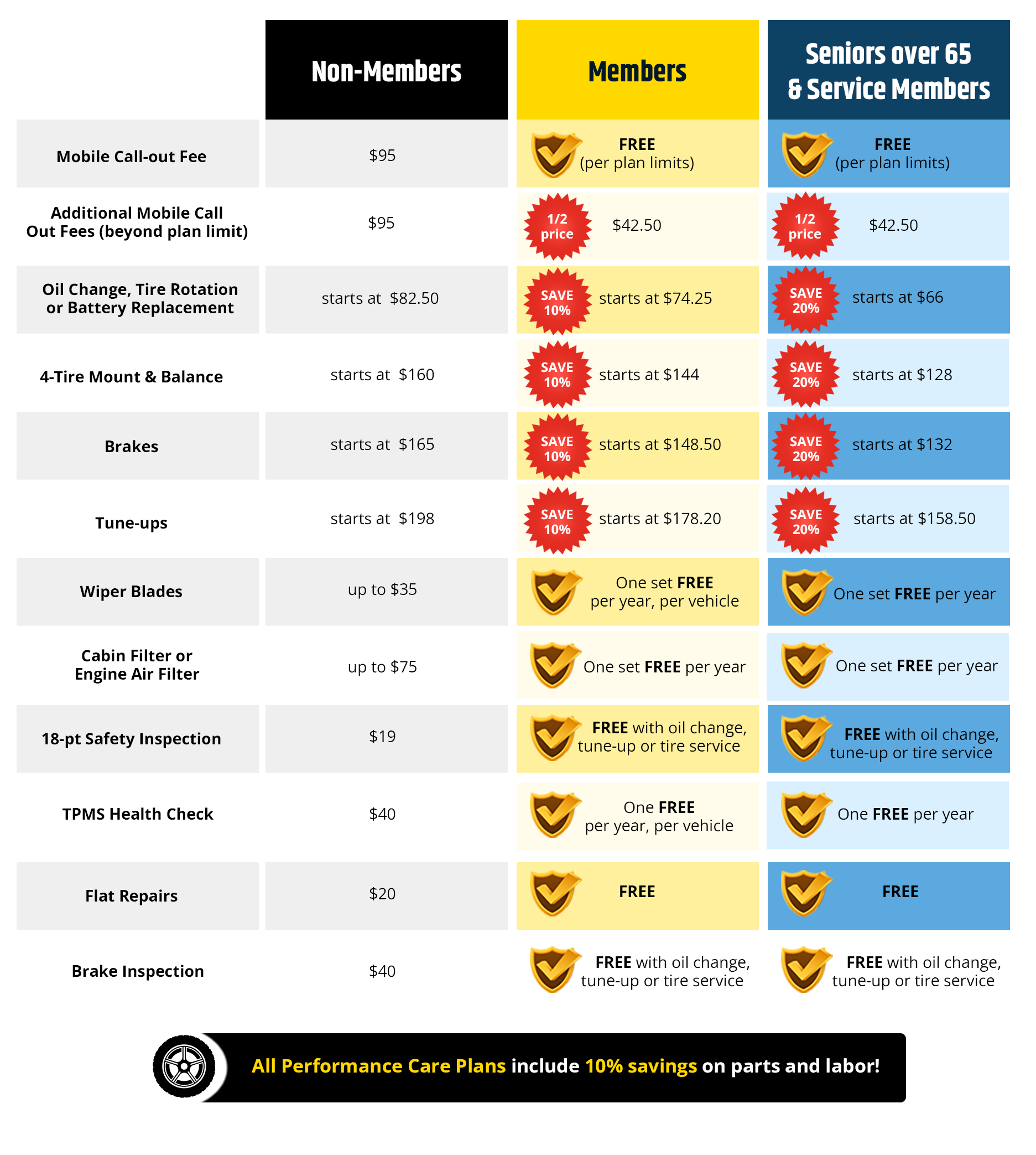 You will get 3-10 call out fees, depending on your plan, and: service reminders, maintenance tracking, priority scheduling, multipoint inspections, and member pricing on tires, brakes, oil changes, tune ups and other preventative maintenance services.